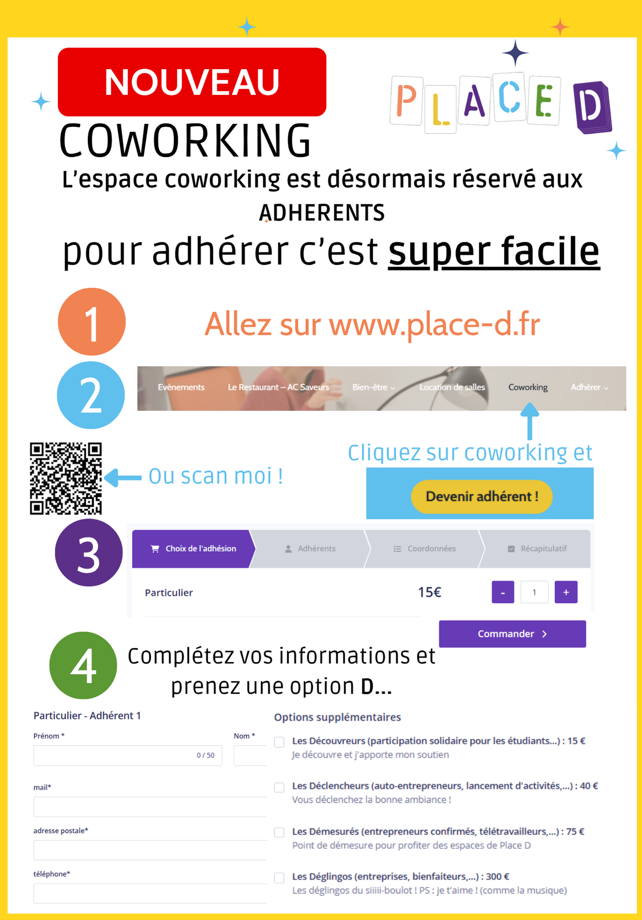 Comment adhérer : en cliquant ci dessous, ou à l’accueil, par mail à collectif@place-d.fr