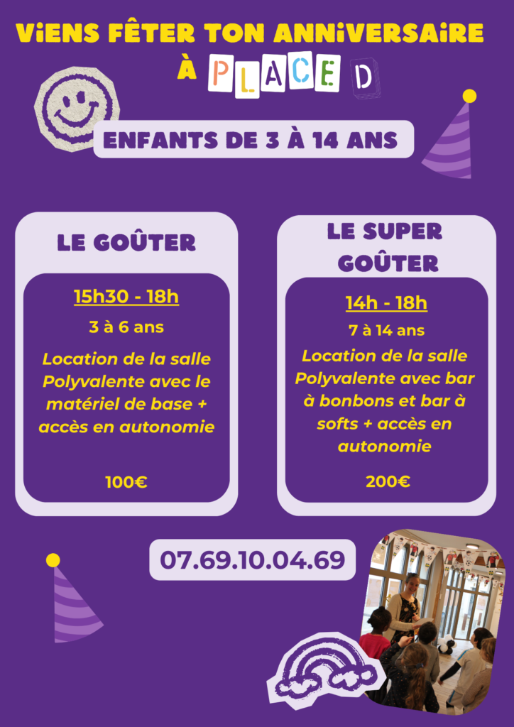 Le samedi ou le dimanche, selon les disponibilités, Place D vous accueille à Melun pour organiser un anniversaire dans un lieu convivial, chaleureux et original ✨ Que ce soit pour un enfant, un ado ou un adulte, notre espace s’adapte à vos envies pour créer un moment festif en toute simplicité.